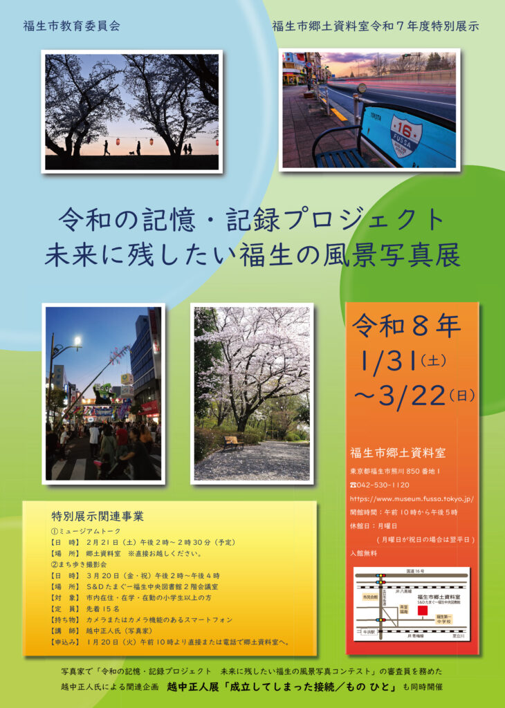 福生市郷土資料室 令和6年度から7年度にかけて実施した「令和の記憶・記録プロジェクト 未来に残したい福生の風景写真コンテスト」の入賞・入選作品を紹介する写真展を実施します。
