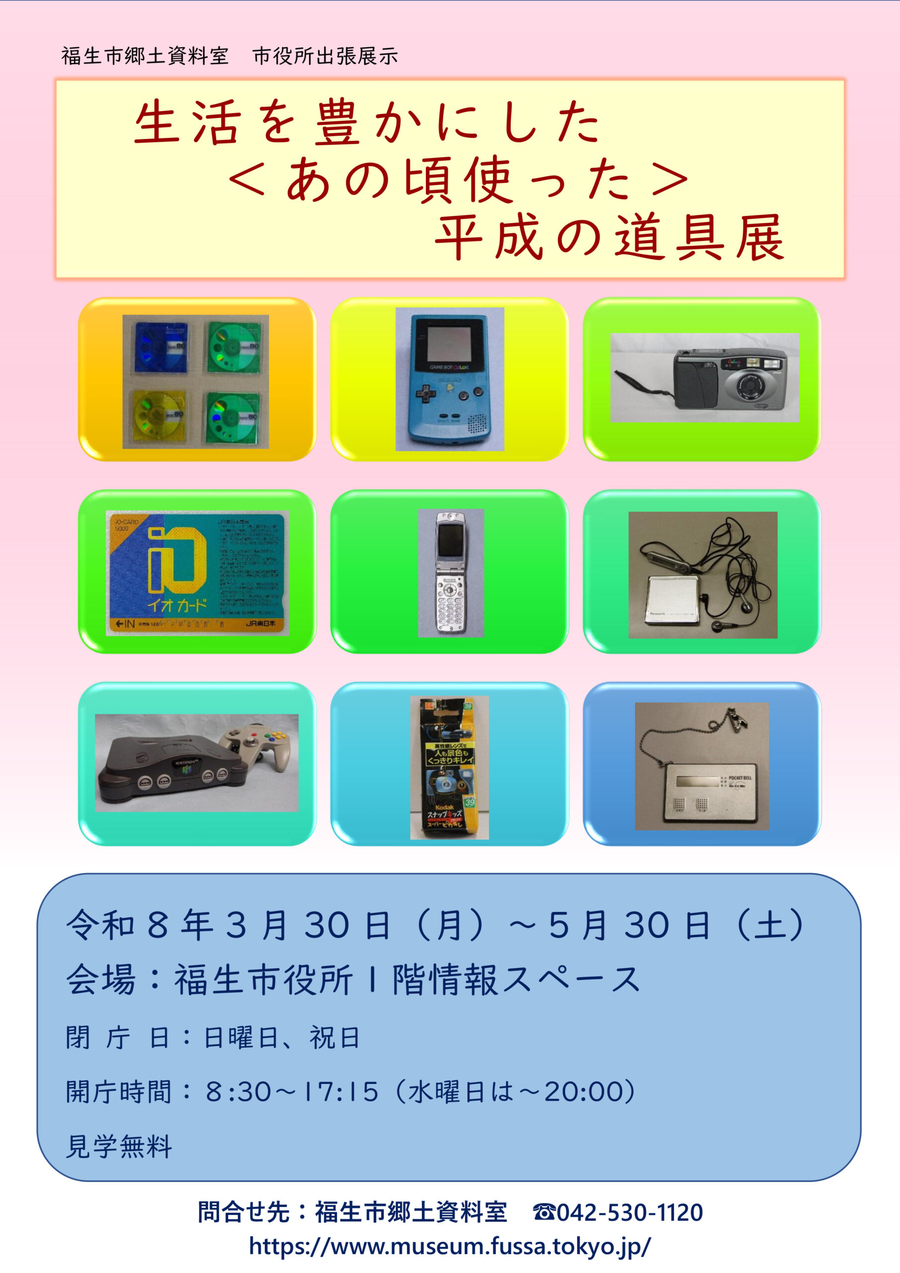 福生市郷土資料室市役所出張展示「生活を豊かにした〈あの頃使った〉平成の道具展」 福生市郷土資料室 2026.03.29 令和8年3月30日(月)~5月30日(土) 移り変わる道具の中から、ポータブル化とデジタル化をキーワードに、平成時代を知る人にとっては懐かしい、生活を豊かにした平成の道具を紹介します。