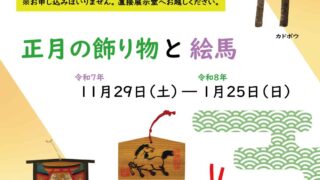 令和7年11月29日(土)~令和8年1月25日(日)  本企画展示では、市内で製作されたミキノクチをはじめとして、小正月に豊作を祈る行事「モノツクリ」などの資料や、令和8年の干支である午にちなんだ「絵馬」の展示を行います。