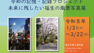 令和8年1月31日(土)~3月22日(日) 令和6年度から7年度にかけて実施した「令和の記憶・記録プロジェクト 未来に残したい福生の風景写真コンテスト」の入賞・入選作品を紹介する写真展を実施します。 令和の福生の記憶を記録した入賞・入選作...